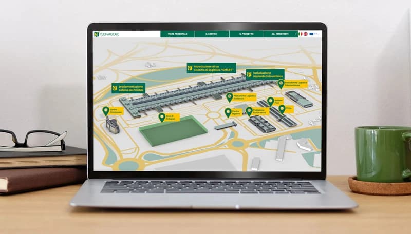 Luogo online in cui il mercato ortofrutticolo di Verona comunica gli interventi progettati e avviati grazie ai fondi del PNRR. Lo spazio virtuale navigabile da computer e da dispositivi mobile consente di conoscere lo stato dei lavori aggiornati con il più recente stato avanzamento. L'integrabilità e aggiornabilità anche con altri contenuti o informazioni lo rende uno spazio utile anche alla promozione e conoscenza più ampia di Veronamercato.